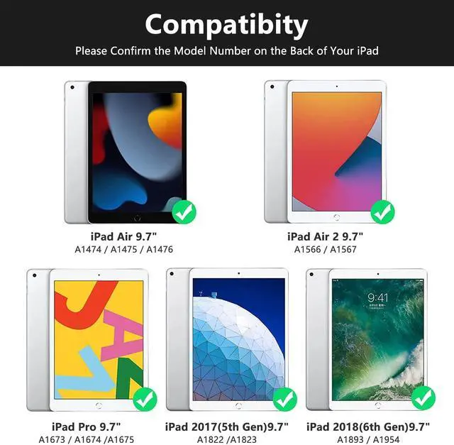 CompatibilityDesigned for 9.7 inch iPad 6th Gen 2018 (A1893/A1954), iPad 5th Gen 2017 (A1822/A1823), iPad Pro 9.7 inch 2016 (A1673/A1674/A1675), iPad Air 2 (A1566/A1567) and iPad Air (A1474/A1475/A1476). Not compatible with any other iPad models. Please check the model of your iPad before making a purchase.