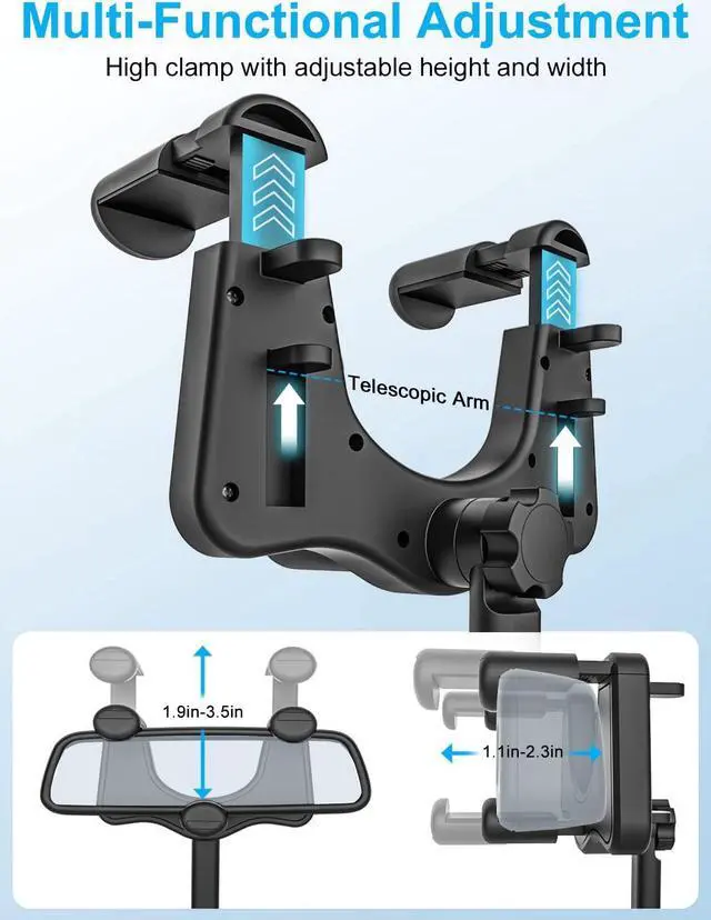 Excellent QualityThe car rearview mirror tablet stand is crafted from high-quality ABS material and features a round design for enhanced durability and resistance to deformation. With an upgraded olecranon telescopic three-claw design and a built-in high-strength spring, it securely clamps onto the rearview mirror. (Suitable for mirrors with a height of 1.9 inches to 3.5 inches and a thickness of 1.1 inches to 2.3 inches)