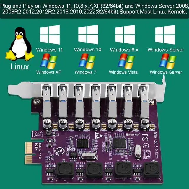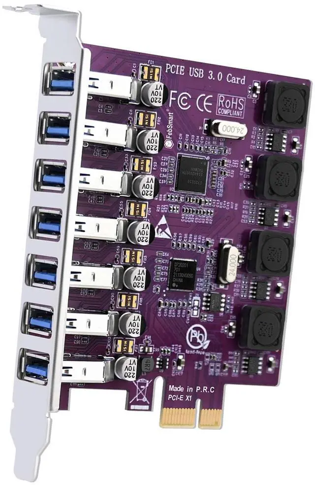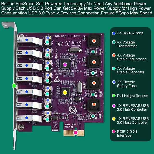 FebSmart 7X 5Gbps USB-A Ports PCIE USB 3.0 Expansion Card for Windows 11, 10, 8. x, 7, Vista, XP Desktop PCs, Built in FebSmart Self-Powered Technology, No Need Additional Power Supply (FS-U7L-Pro)