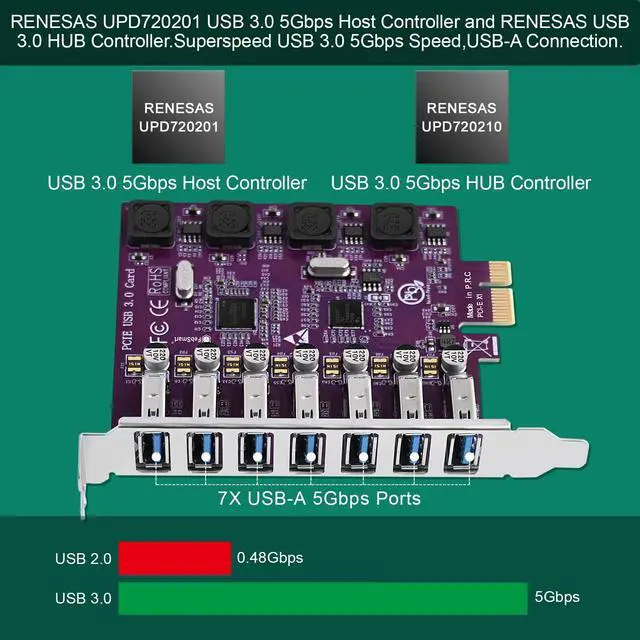 2. Based on 1X RENESAS UPD720201 5Gbps USB 3.0 host controller and 1X RENESAS UPD720210 5Gbps USB 3.0 HUB controller, will compatible with AMD, ARM, and Intel hardware platform Desktop PCs. The added-on 7X USB 3.0 ports will share 5Gbps total bandwidth. It will compatible with 7X normal USB devices such as USB keyboard, USB mice, USB speakers, USB KVM switch, USB HUB, USB flash drive, printers, game pad, smartphone, tablet, and more USB-A interface devices.