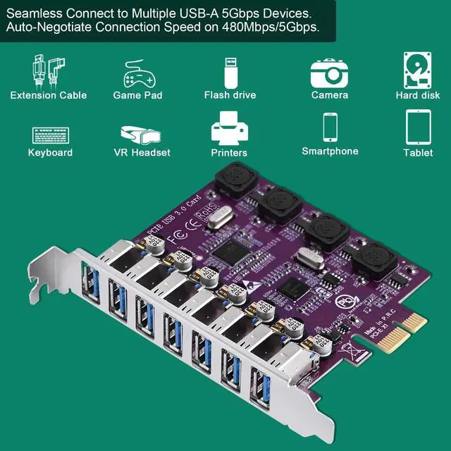 1. FS-U7L-Pro is a PCIE X1 interface to 7-Ports USB 3.0 Type-A expansion card. Allow users add 7X superspeed 5Gbps max USB 3.0 vertical ports on Desktop PCs, Working Stations, and NAS Data Centers for large data transfers. It will light up 7X high power consumption USB 3.0 devices which including USB-A industrial cameras, USB-A VR-Systems, USB-A NVME enclosures, USB-A live broadcast devices, USB-A SSD/HDD enclosures, USB-A video adapters and USB-A universal docking stations.