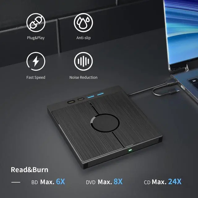 Support 100G Burning Technology:Compared to a usb blu ray drive external, this product Support 100G BD disc reading & writing, this blu ray dvd player features an advanced high-speed 3.0 interface that reaches a maximum speed of 5Gbps, which is 6 times faster than traditional 2.0 (480Mbps). Additionally, the Type-C interface has strong error correction capabilities, impact resistance, and low power consumption, ensuring stable and reliable data transfer. And our drive can read BD discs at speeds of up to 6x, DVDs at up to 8x, and CDs up to 24x
