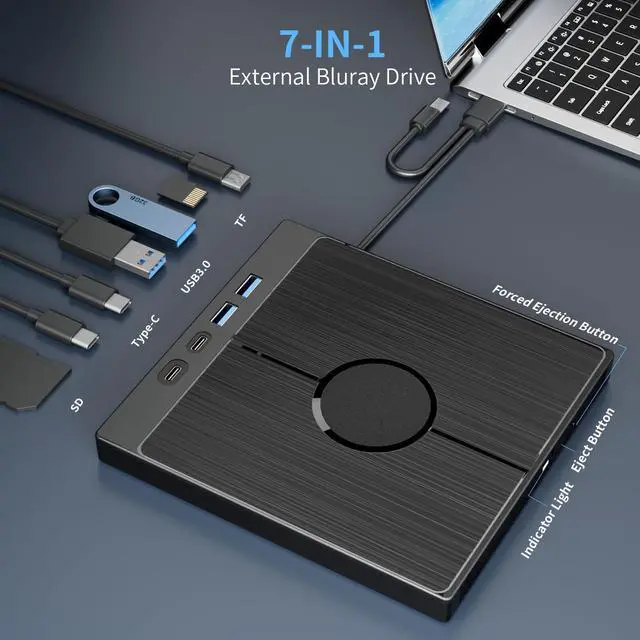 External Blu Ray Drive 7in1, Portable Blueray/DVD Drive for PC with USB 3.0/Type-C/SD/TF Card Ports, Support 100G Disc USB Blu Ray Drive External, Blu Ray Burner for Windows XP/7/8/10/11 Mac Laptop