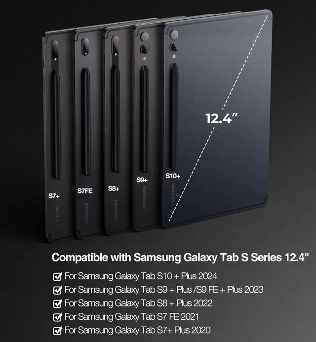 ENHANCED COMPATIBILITYExclusively designed for Samsung Galaxy Tab S10+ Plus 12.4 inch (2024), Samsung Galaxy Tab S9+ Plus/S9 FE+ Plus 12.4 inch (2023), Samsung Galaxy Tab S8+ Plus 12.4 inch (2022), Samsung Galaxy Tab S7 FE (5G) 12.4 inch (2021), and Samsung Galaxy Tab S7+ Plus 12.4 inch (2020) tablets. (Tablet and S Pen not included.)