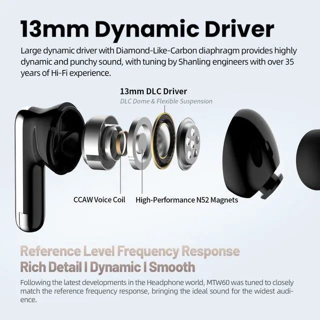 13mm DLC diaphragm moving coil + reference level frequency response curve, HiFi sound quality: the use of 13mm DLC diamond-like diaphragm moving coil unit, high rigidity dome and flexible suspension combined, taking into account the surging bass and delicate high-frequency, restore the details of the music; based on the 36 years of acoustic tuning of the SHANLING, the frequency response curve is close to the ideal sense of the human ear, the low-frequency thick full-bodied, middle and high f