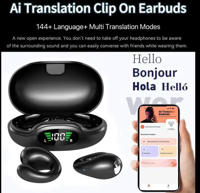 YLYHHFY AI Translation Earbuds Real Time, 144 Language Translator Clip On Bluetooth 5.3 Wireless Earbuds Headphones Ordinary Earphones with AI Translation Function for Travel Business and Learning