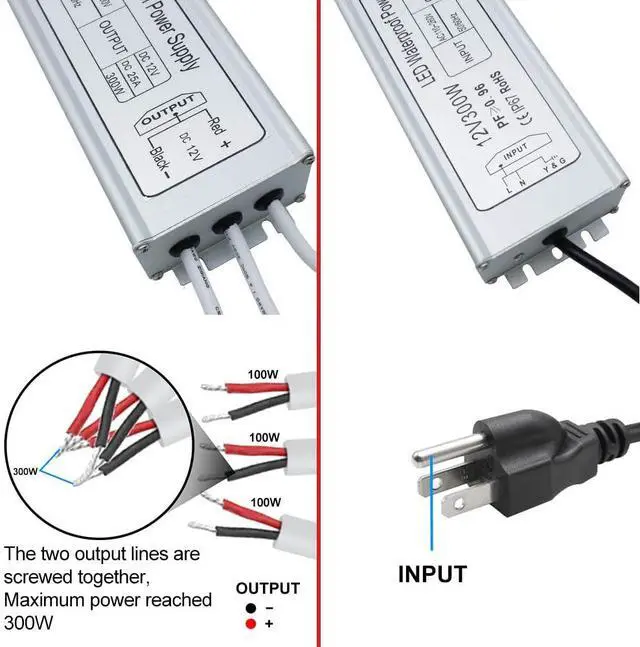 Converts 110V AC to 12V DC with 3 outputs of 100W each, totaling 300W. Ideal for 12V DC LEDs (300W). Ideal for outdoor lighting, industrial settings, and events; ensures reliable and safe power for smooth operation in challenging conditions