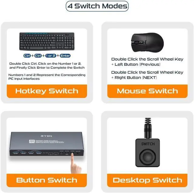 Supports 4 switch modes: Keyboard hotkey switch, Mouse hotkey switch (double-click scroll wheel+left/right buttons), Extension cable Desktop Controller, Product Switch Button.