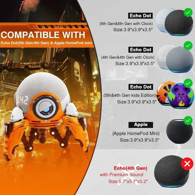 Smart Speaker Stand: This stand is suitable for Echo Dot 5th & Echo Dot 4th Generation, Echo Dot 5th & Echo Dot 4th Generation with Clock, Echo Dot 5th&4th Generation Kids and Homepod mini. It should be noted that this stand does not work with other Echo series.