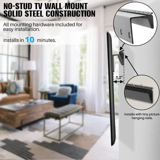 Renter Friendly TV Mount: Installs in 10 minutes with tiny picture hanging nails. Built-in bubble level ,Foam Backing and all mounting hardware included NoteDrywall thickness must be greater than 0.4"