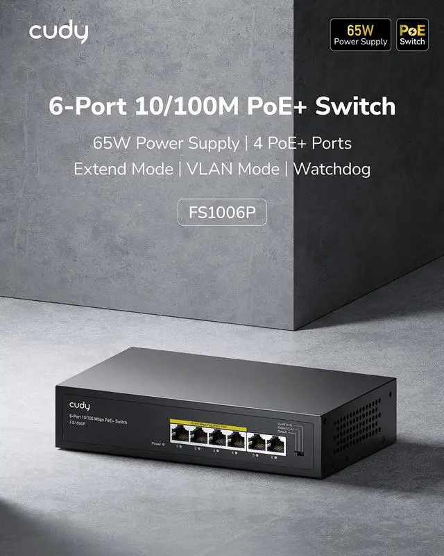 Cudy FS1006P 6-Port 10/100M PoE Switch 60W, 4 PoE Ports, CCTV Mode (Transmit Distance to 250m at 10Mbps), PD Detection, Fan-Less, Steel Case, Desktop and Wall-Mount, 802.3 at / 802.3 af