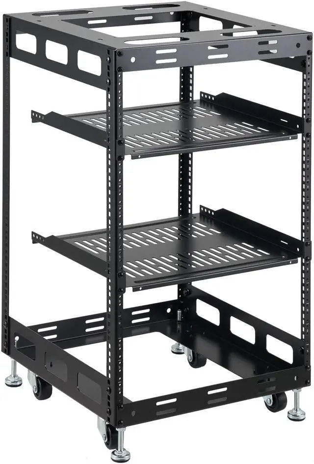 Tedgetal 15U Open Frame Rack for Servers & AV Gear - Wall Mountable Design Includes 2X Vented Shelves, 4X Leveling Feet, 4X Casters