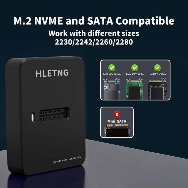 Widely Compatible NVMe M.2 ReaderHLETNG M.2 NVMe SSD Reader supports M key and B+M key M.2 SSD in sizes :2280/ 2260/ 2242 /2230 and is compatible with Windows, Linux, MacOS, and Android systems (Note: SSDs with heat sinks or M.2 PCIe (AHCI) SSDs and Mini SATA SSD are not supported)