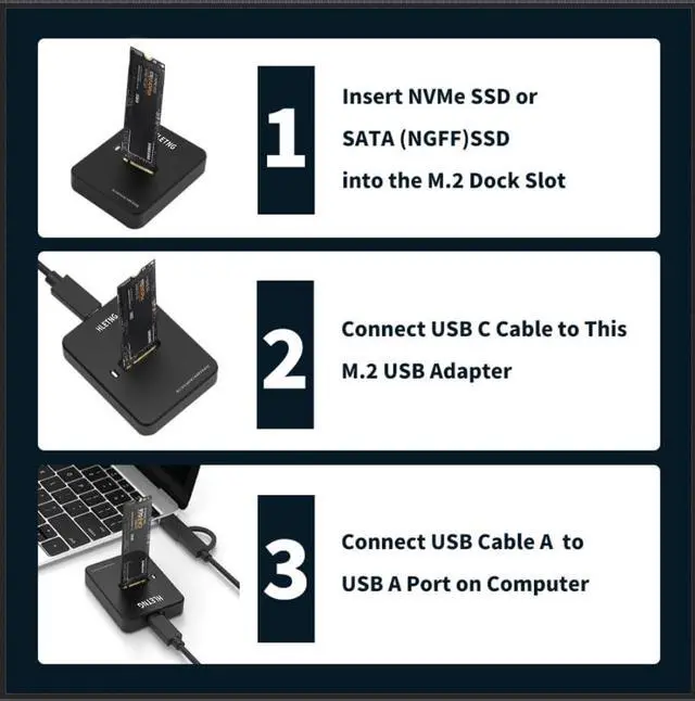 USB 3.2 NVMe AdapterThis External M.2 SATA NVMe Adapter adopts the USB C 3.2 interface and with theoretical data transfer speeds of up to 10Gbps for NVMe SSDs and 6Gbps for SATA NGFF SSDs,the HLETNG M.2 Adapter can quickly process large capacity data, designed specifically for troubleshooting and data recovery, making your work easier