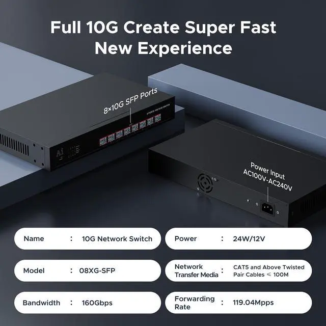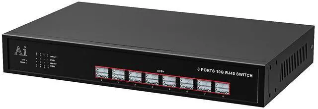 Full 8 Port 10Gbps SFP+ Ethernet SwitchThe product features 8 10Gbps SFP+ Ethernet ports and adopts high-quality, high-speed network chip solutions, all 10Gbps ports, line speed forwarding is smoother, the SFPports support 1.25G/2.5G/10G, adopting store-and-forward mechanism, and integrating high-capacity cache internally, which ensures that all the ports can realize 10Gbps non-blocking line speed forwarding, and adapt to more emergent situations.