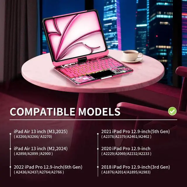 CompatibilityCompatible Only with iPad Air 13" (M3/M2, 2025/2024) and iPad Pro 12.9" (2018/2020/2021/2022) Supports models A2764, A2437, A2436, A2378, A2379, A2461, A2462, A2229, A2069, A2232, A2233, A1876, A2014, A1895, and A1983. Please verify your iPads model number (starting with "A") on the back of your device before purchasing to ensure compatibility.