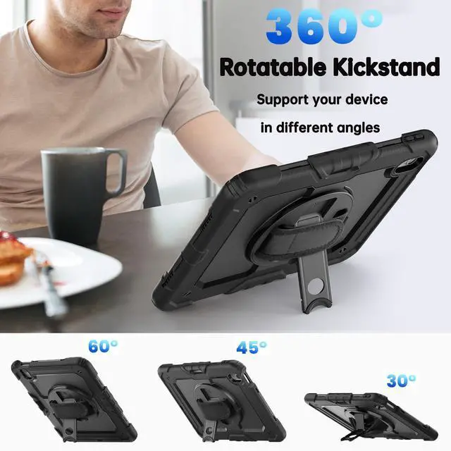 360 Rotatable Kickstand + Hand StrapiPad Air 11 M3/M2 case built in 360 degree rotatating kickstand provide you more angles for typing, reading, watching video, playing game ect. The handheld velcro strap on the back is perfect for using the tablet and keeping it steady while moving around. Ideal for conference, class, engineer outdoor operation ect.