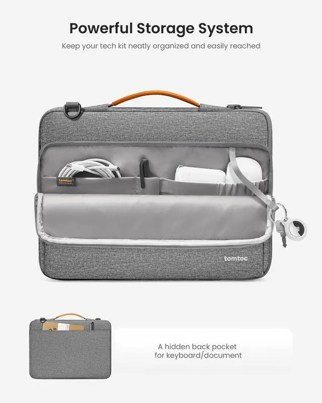 Convenient, Organized Storage System: This computer briefcase has an intelligent front storage compartment with several small pockets for charger cable, USB hub, iPad, etc. And a strap for AirTag or key. A hidden back pocket for storing personal belongings such as documents, mobile phones, and cards is convenient to access while remaining secure