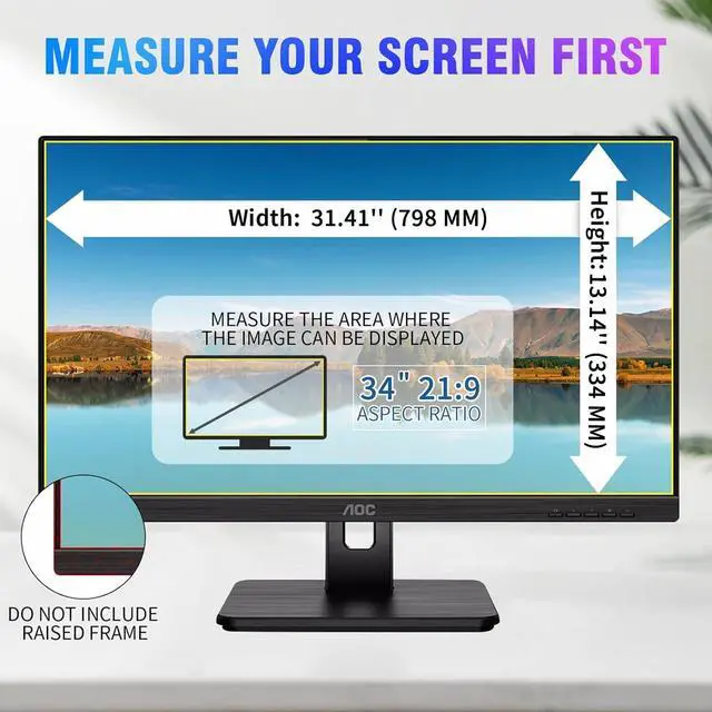 Privacy Filter Size34-inch monitor privacy screen fits monitors with an aspect ratio of 21:9. Actual filter size: 31 4/1 inches (798mm), height: 13 1/4 inches (334mm), diagonal: 34 inches (863.6mm). Compatible with HP, Dell, Samsung, Lenovo, LG, Acer, Asus, Viewsonic and other monitor brands. Please verify the width and height measurements of your computer screen before ordering. It is not recommended to select based solely on the diagonal size of your computer screen.