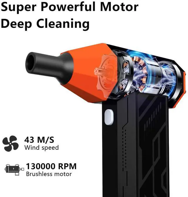 Super Power Turbo FanThis electric air duster, featuring a state-of-the-art brushless motor that reaches up to 130,000 RPMand peak wind speeds of over 52 m/s (Super Typhoon 51.0 m/s) 180g of air pressureThe electric air duster effectively removes dust and debris from computers and electronics, perfect for thorough cleaning at home, in the office. and outdoors.