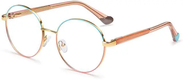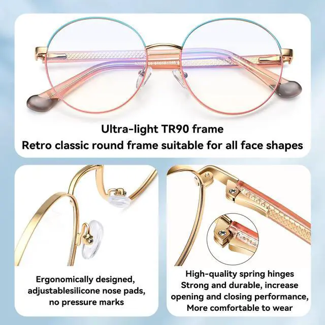 This is a pair of blue light blocking glasses that can block blue light and UV rays, helping you relieve eye fatigue when facing electronic products. This computer glasses uses TR90 soft material and a stylish round black metal frame, adding a cute and fashionable feel to this women's glasses. The blue light blocking glasses are equipped with durable flexible spring hinges, suitable for any face shape, and its lightweight material can reduce the burden on the bridge of the nose. All details ensure that you can wear it comfortably and durable for a long time.