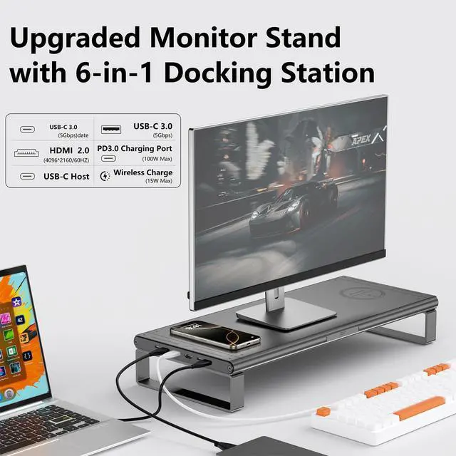 Premium 6-in-1 Docking Station & 15W Max Wireless Charger: Boost efficiency with a studio desk shelf that combines a 6-in-1 docking station (4K@60Hz HDMI, USB3.0, PD100W) and 15W max wireless charger. Streamline desk organization while charging laptops, phones and peripherals at once.