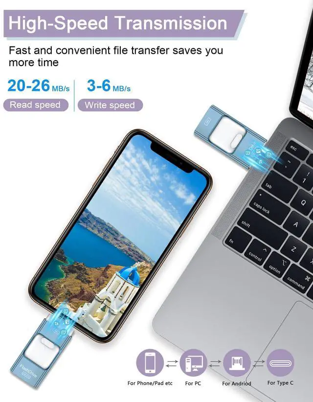 High-Speed File Transfer: With our high-speed 128GB thumb drive, you can say goodbye to slow file transfer rates. Experience reading speeds of up to 10 MB/s and writing speeds of up to 10 MB/s, so you can back up photos, videos, and documents with just one click and free up your phone storage without using cables or cloud storage.