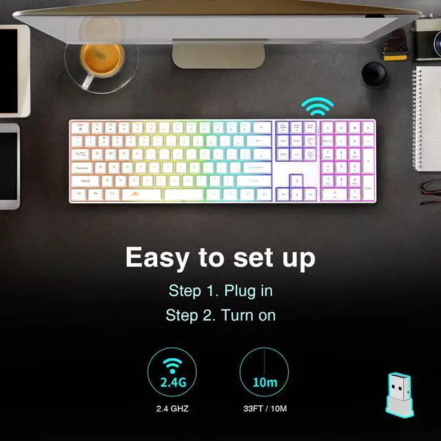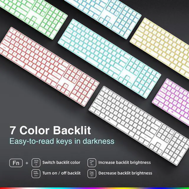 Experience True Illumination This wireless keyboard features multi-color backlit with adjustable brightness, ensuring crystal-clear visibility day and night. Laser-etched keycaps allow the backlit to shine through, highlighting each character for an effortless and comfortable typing experience in any environment, office, gaming, home, etc.