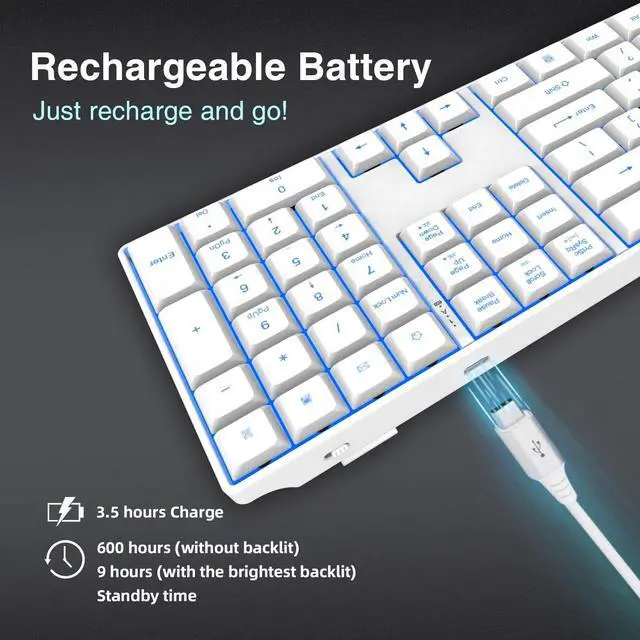 Wireless Freedom, Effortless PowerExperience the freedom of wireless typing with this keyboard's built-in rechargeable lithium battery. Simply use the included charging ca