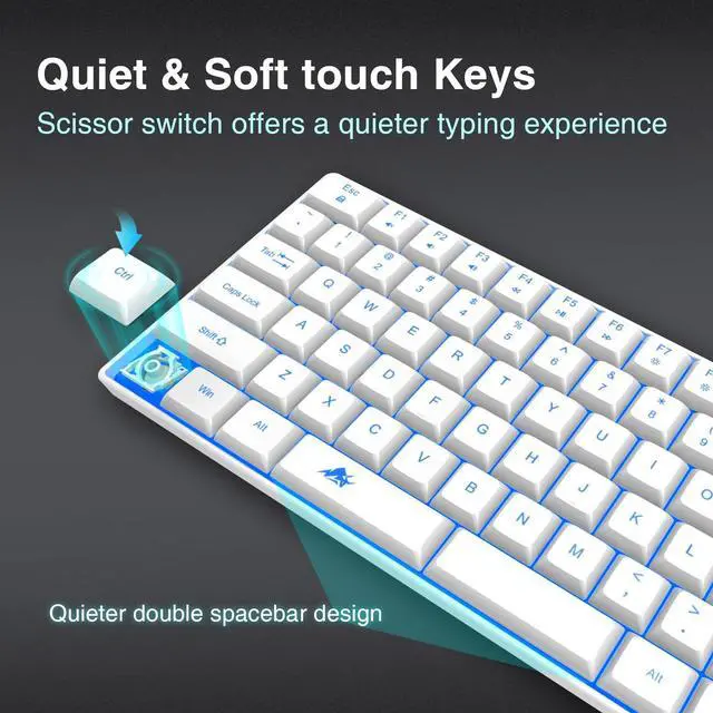 Type with Comfort and ConfidenceExperience the perfect blend of soft touch, precision, and quiet with this keyboard. Featuring low-profile keycaps and a high scissor-switch design, every keystroke delivers satisfying tactile feedback without the excessive noise of traditional keyboards. Scissor keys provide a responsive and comfortable typing experience, while the innovative dual spacebar design further minimizes noise disruption for a quiet typing experience.