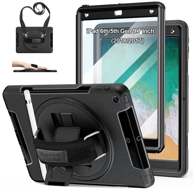 Case for iPad 6th/5th Generation 9.7 INCH: TPU Cover for iPad 9.7 (2018/2017) & iPad Air 2 9.7" with Screen Protector- Stand- Handle- Shoulder Strap-Pencil Holder- Black