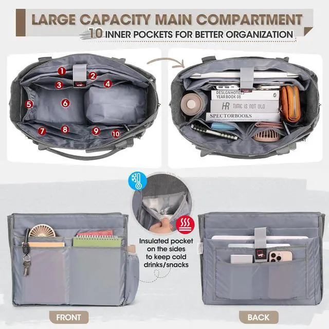 Large Capacity & Multiple Pockets: The laptop bag for women with over 15 pockets can easily hold all your daily necessities. The main compartment has a padded sleeve for 15.6" laptop & 12.9" iPad, plus 6 open slots and an insulated bottle pocket. The dual-layer front organizer offers quick access- the outer layer has a flip-top and zippered pocket, and the inner layer contains 1 open pocket, 4 elastic loops, and 1 mesh pocket. Side lunch pocket keeps food fresh; A back pocket for docume