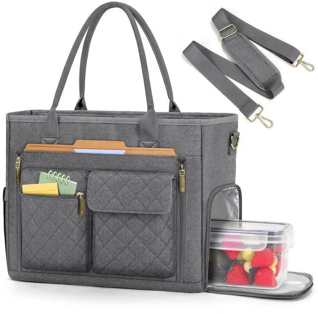 RAINSMORE Teacher Tote Bag with Insulated Lunch Compartment 15.6 inch Laptop Bag for Women Lightweight Work Bags Nurse Bags Professional Briefcase Computer Handbag for Office, College, Nursing, Grey
