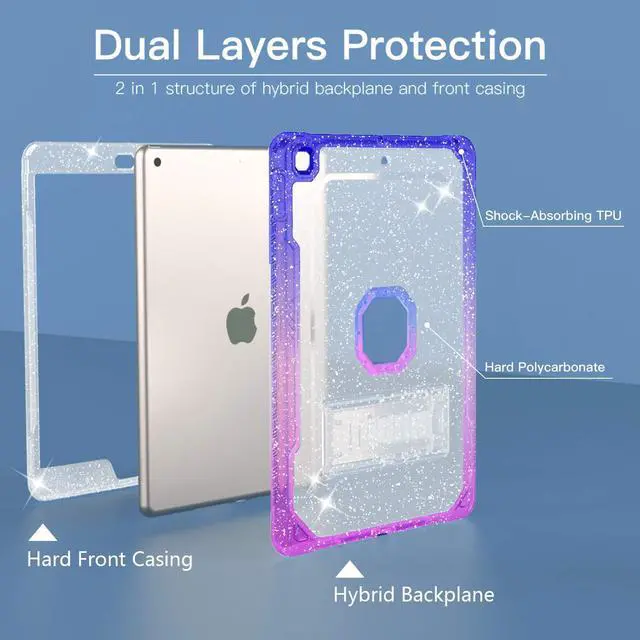 ZoneFoker for iPad 9th Generation Case, for iPad 8th/7th Gen 10.2 inch Case 2021/2020/2019, Clear Glitter Dual-Layer Slim Sturdy Case with Stand Tablet Cover for Kids/Girl/Women-PurpleToBlue