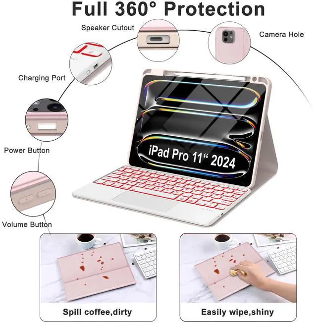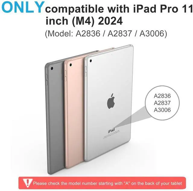 iPad Pro 11 inch CompatibilityKeyboard Case for iPad Pro 11-inch (M4): This keyboard case ONLY compatible with iPad Pro 11 inch (M4) 2024 (Model: A2836 / A2837 / A3006). It is Not compatible with any other models. Please check the model number starting with "A" on the back of your tablet before purchasing.