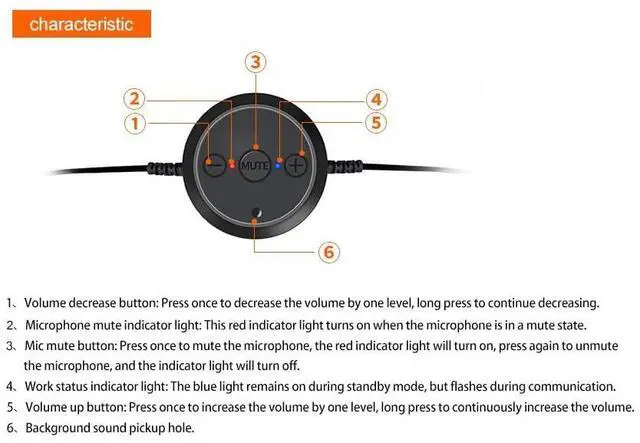 Mic mute button: Press once to mute the microphone, the red indicator light will turn on, press again to unmutethe microphone, and the indicator light will turn off.