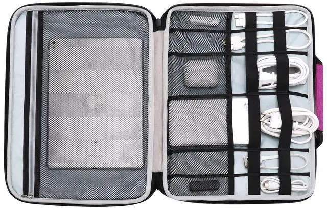 Laptop pocket and Accessories pockets keep separate. One side for 11.6 inch laptop/ iPad. Another side has 6 mesh bag, it can easily place power adapter, mouse, notebook, etc. Elastic loops to hold various items like cables, pens, U disk, USB drives, mobile phone, charger, passport, headphones, etc