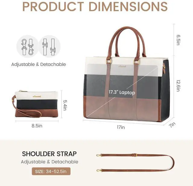 Perfect SizeThe dimension of the laptop tote bag for women is 17" L x 7" W x 12.6" H.Net weight: 2.39 lb. Handle drop: 9.8'', this women's briefcase comfortably fits most 13" to 17.3" laptops. The durable metal base ensures it stands upright on its own and handles the daily wear and tear of your busy lifestyle.