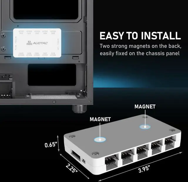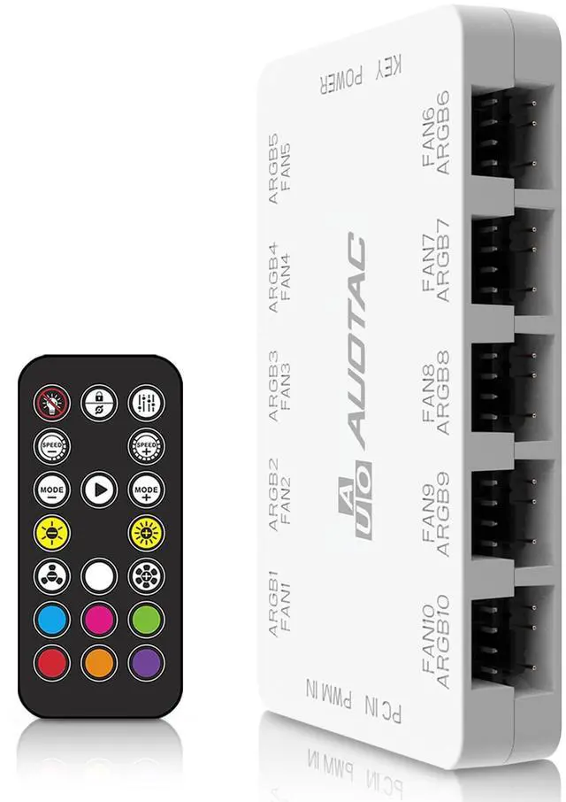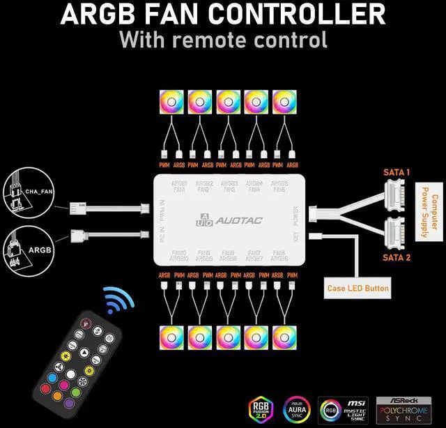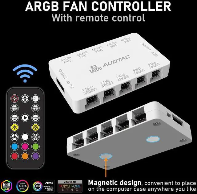 Auotac ARGB Controller PWM Fan Hub with RF Remote, (Connect Ten Case Fans, 5V 3Pin ARGB & 12V 4Pin PWM Fan Connector, Dual SATA Power Input, Magnetic Suction), White