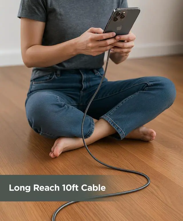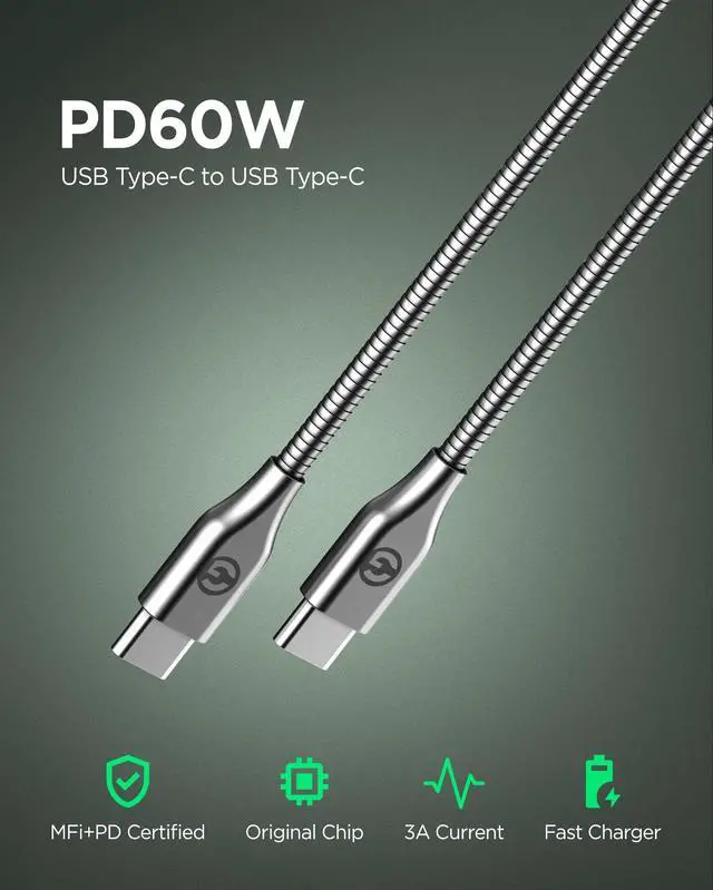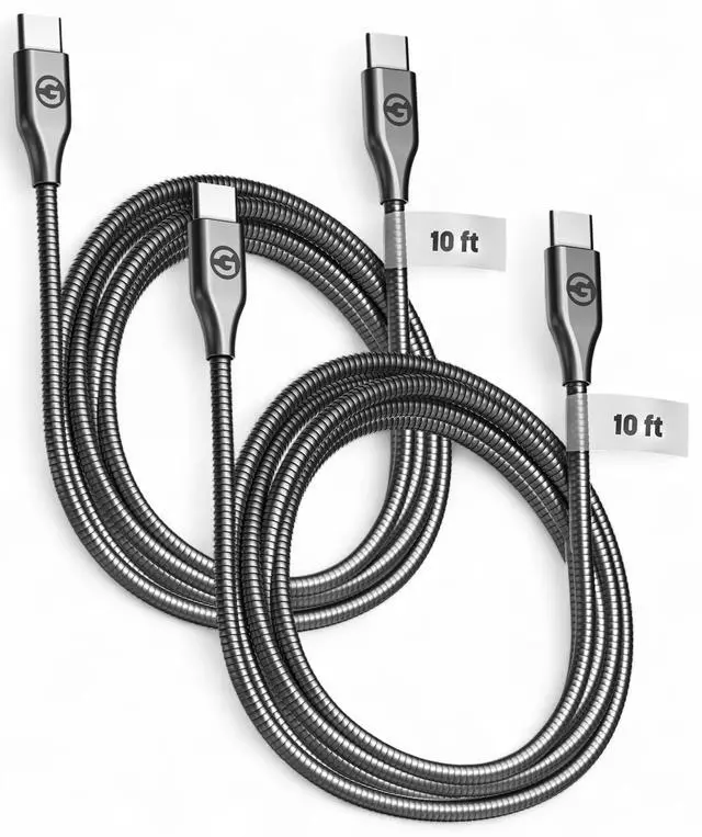 USB Type-C Cable length: 10 FT 3.50 mm thick cable with metal jacket Anti-wear metal alloy braided cable with zinc alloy connector heads Compatible with PD charging Supports charge speeds up to 3A/60W (with compatible USB-C PD power supply) Supports transfer speed up to 480Mb/s 20000+ bend lifespan