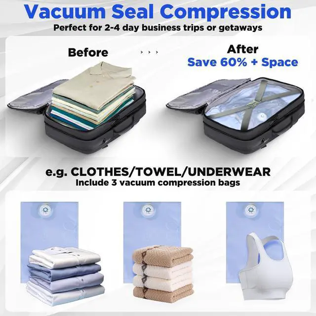 [ " ]: Our improved vacuum travel backpack has 70% more main compartments and vacuum compression bags have been increased to 3, providing more space for your belongings. Combined with the extended design, the capacity of the backpack can go from 40L to an impressive 60L, perfect for long trips, you can prepare it for 3-4 days business journey, a weekend vacation or a hiking trip. You will never run out of space again!