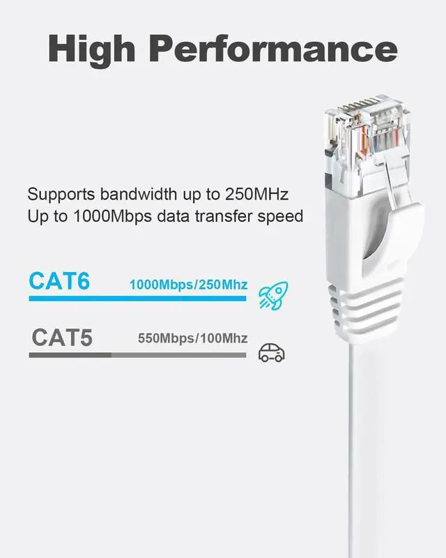 HIGH SPEED TRANSMISSIONCat6 cable with high bandwidth of up to 350 MHz and 1Gbps ensure high-speed data transfer for server applications, cloud storage, video streaming and playing games without worrying about cables causing a mess. Supports: Gigabit 1000 BASE-T; 100 BASE-T; 10 BASE-T.