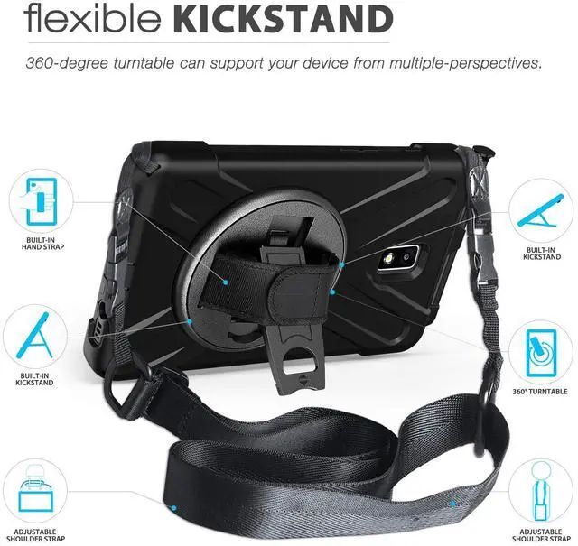 360° Rotating Stand and Hand StrapLocated on the back of Samsung Galaxy Tab Active 2 8.0 case,built-in 360 Degree rotating Kickstand and Adjustable Handle Hand Grip provide a flexible and comfortable way to use your tablet for outdoor work.