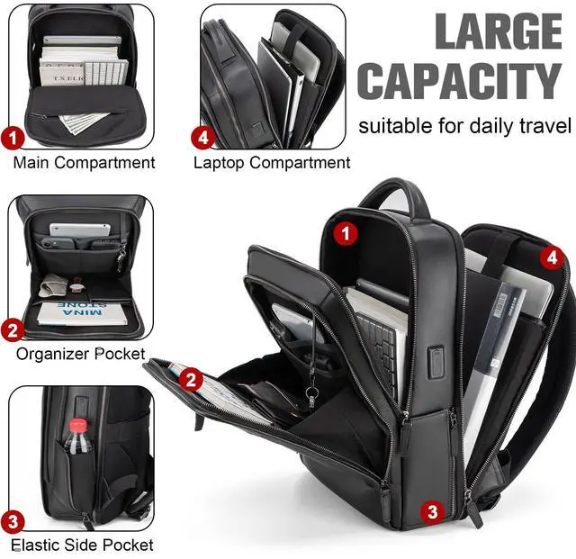 Large Capacity and OrganizedTzowla Leather backpack has one separate laptop compartment that can hold laptop up to 15.6 inch. It also has one spacious compartment for storing any item like daily necessities, tech related items, accessories, wallet,mouth wash,deodorant and many more.There is an organizer pocket on the front of the backpack, which can be used to neatly store pens, keys, passports and other items. The side pockets can also be used to store water bottles and umbrellas.