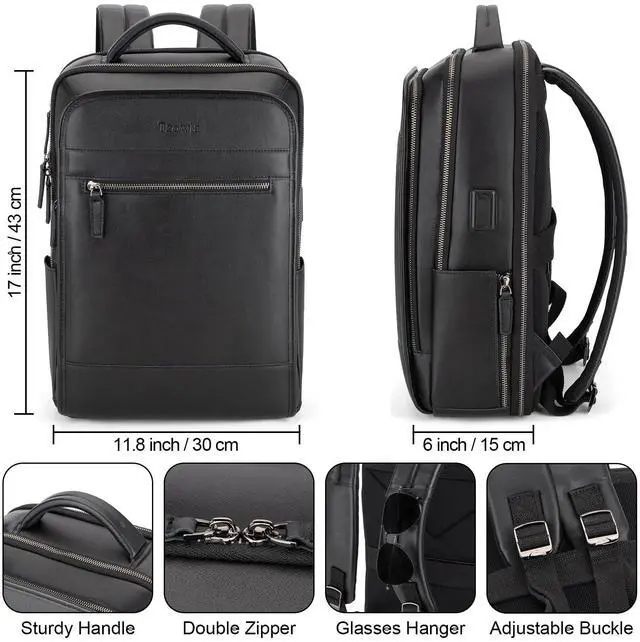 Tzowla Leather Laptop Backpack, Bag for Men and Women,Business Travel Work Rucksack Fits 15.6 Inch Laptop,Bookbag with USB and Type-C Charging Port-Black