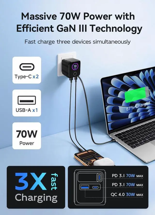 Triple-Device Charging with 70W GaN Power Power up to three devices simultaneously with dual ports and the built-in retractable USB C cable. Ideal for charging laptops, phones, and headphones at high speed. The GaN-powe