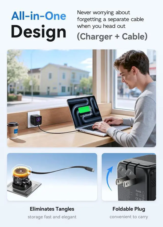 70W High-Speed Retractable USB C Charger Experience lightning-fast charging with our 70W wall charger, featuring advanced GaN chip technology for superior efficiency and heat reduction. The built-in retractable USB C cable for tangle-free convenience and compact storage. Perfect for laptops, tablets, and phones.
