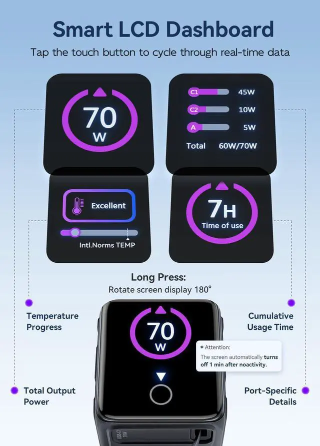 Smart Touchscreen Display & Rotatable Interface Upgrade your charging experience with an interactive touchscreen! Lightly tap to cycle through real-time power data and safety tips for charging temperature. Long press to rotate the display 180° for flexible viewing. The screen auto-sleeps after 1 minute to prevent nighttime disturbancessimply touch to reactivate. This retractable charger combines innovation with user-friendly functionality.