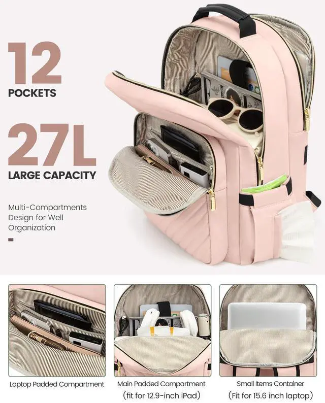 LAPTOP PROTECTIONThe laptop backpack is designed with 15.6-inch laptop separate compartments and a 12.9-inch iPad slot; with cushioned cotton sewn around, it maximizes physical protection of your electronic devices.