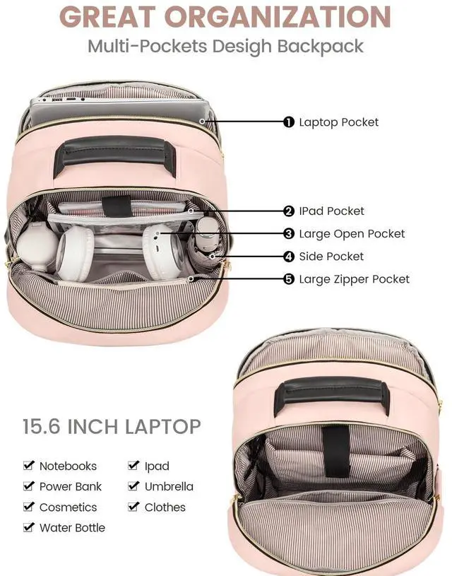 MULTI-COMPARTMENTS & POCKETSThis women's business work backpack is designed with 4 compartments and 17 pockets. Ample pockets keep your travel items organized.